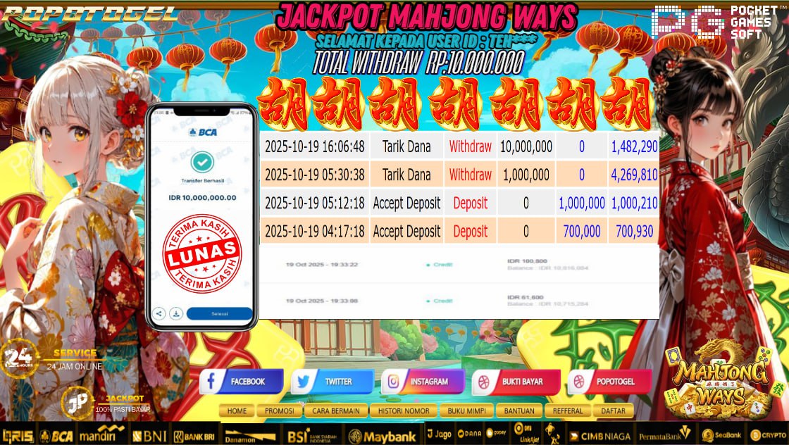 Selamat kepada USER ID :TEH*** Telah berhasil mendapatkan kemenangan besar pada JACKPOT MAHJONG WAYS RP 10.000.000,- LUNAS Setelah mengisi formulir withdraw dengan kurung waktu hanya 5 – 10 menit pihak popotogel sudah melakukan transfer kepada pemilik USER ID dan dana sudah dapat dicairkan oleh pemenang. Bukti pembayaran yang kami berikan merupakan bukti pembayaran yang SAH / VALID yang langung di dapatkan melaui tanda transfer transaksi dari Bank yang dituju.