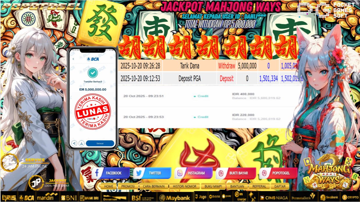 Selamat kepada USER ID :DAHLI*** Telah berhasil mendapatkan kemenangan besar pada JACKPOT MAHJONG WAYS RP 5.000.000,- LUNAS Setelah mengisi formulir withdraw dengan kurung waktu hanya 5 – 10 menit pihak popotogel sudah melakukan transfer kepada pemilik USER ID dan dana sudah dapat dicairkan oleh pemenang. Bukti pembayaran yang kami berikan merupakan bukti pembayaran yang SAH / VALID yang langung di dapatkan melaui tanda transfer transaksi dari Bank yang dituju.