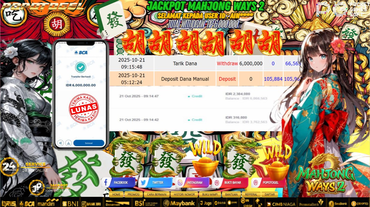 Selamat kepada USER ID :AIN*** Telah berhasil mendapatkan kemenangan besar pada JACKPOT MAHJONG WAYS 2 RP 6.000.000,- LUNAS Setelah mengisi formulir withdraw dengan kurung waktu hanya 5 – 10 menit pihak popotogel sudah melakukan transfer kepada pemilik USER ID dan dana sudah dapat dicairkan oleh pemenang. Bukti pembayaran yang kami berikan merupakan bukti pembayaran yang SAH / VALID yang langung di dapatkan melaui tanda transfer transaksi dari Bank yang dituju.