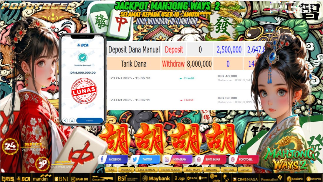 Bukti Pembayaran Kemenangan Rp.8.000.000 Juta permainan SLOT MAHJONG WAYS 2 USER ID:AMOYA*** LUNAS!