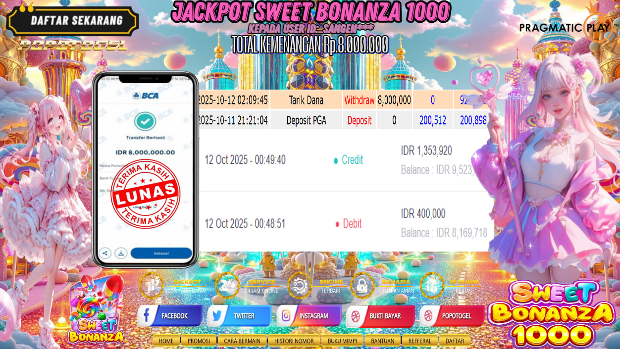 Selamat kepada USER ID :SANGEN*** Telah berhasil mendapatkan kemenangan besar pada JACKPOT PERMAINAN SWEET BONANZA 1000 RP.8.000.000,- LUNAS Setelah mengisi formulir withdraw dengan kurung waktu hanya 5 – 10 menit pihak popotogel sudah melakukan transfer kepada pemilik USER ID dan dana sudah dapat dicairkan oleh pemenang. Bukti pembayaran yang kami berikan merupakan bukti pembayaran yang SAH / VALID yang langung di dapatkan melaui tanda transfer transaksi dari Bank yang dituju.