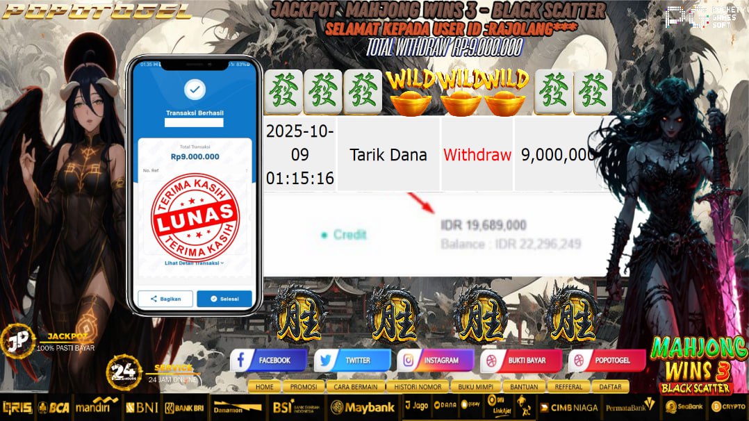 Selamat kepada USER ID :RAJOLANG*** Telah berhasil mendapatkan kemenangan besar pada JACKPOT PERMAINAN MAHJONG WINS 3 – BLACK SCATTER RP.9.000.000,- LUNAS Setelah mengisi formulir withdraw dengan kurung waktu hanya 5 – 10 menit pihak popotogel sudah melakukan transfer kepada pemilik USER ID dan dana sudah dapat dicairkan oleh pemenang. Bukti pembayaran yang kami berikan merupakan bukti pembayaran yang SAH / VALID yang langung di dapatkan melaui tanda transfer transaksi dari Bank yang dituju.